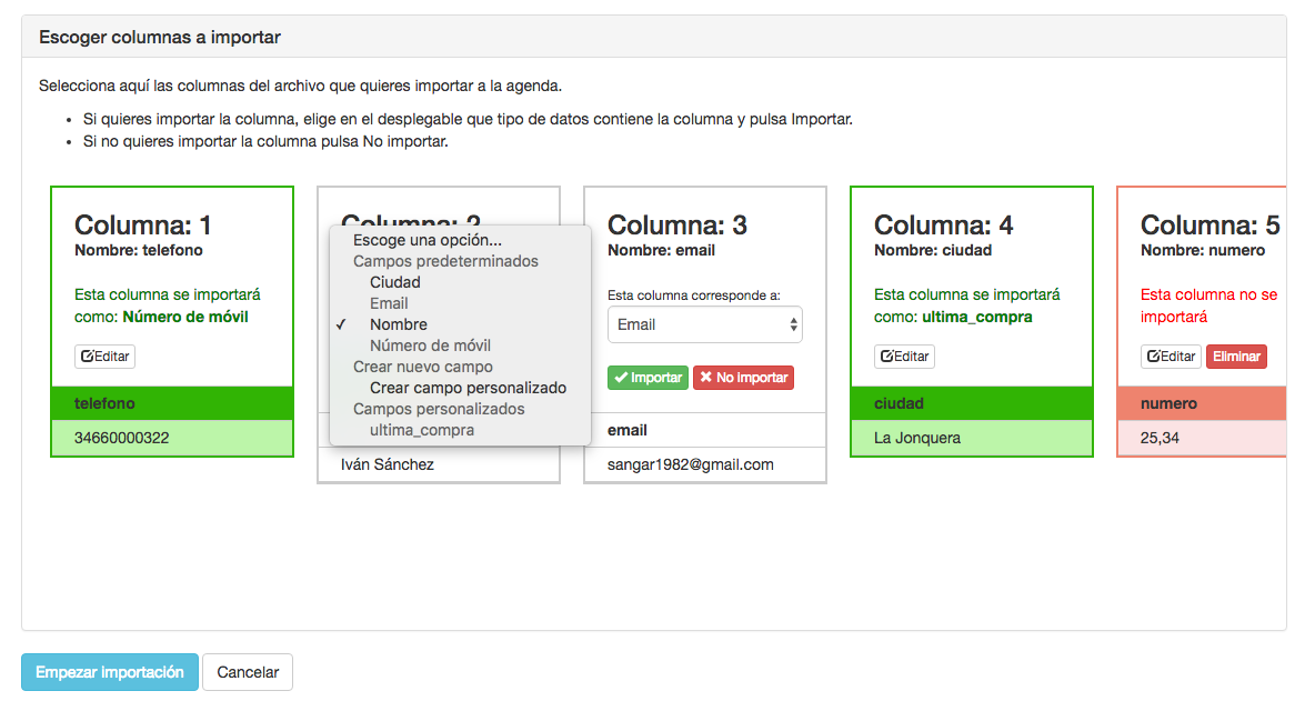 El proceso de importación de contactos se hace en dos pasos: