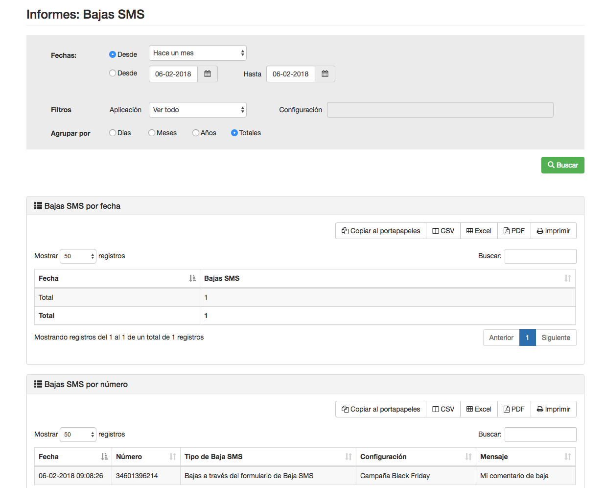 Y también podrás exportar los datos de las Bajas SMS para que puedas analizarlos externamente y optimizar tus envíos.