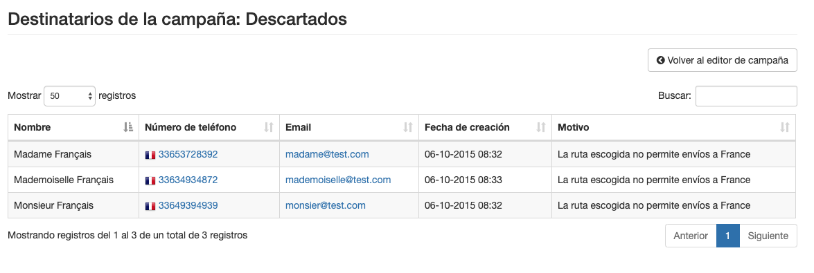Si pulsas encima de cada uno de los contadores, podrás consultar el listado de contactos que lo componen. En este caso, estamos viendo los descartados del ejemplo anterior.Así que una buena organización de tus agendas, dependiendo de tu tipo de negocio y la segmentación que elijas, te ayudará a realizar mejores envíos.