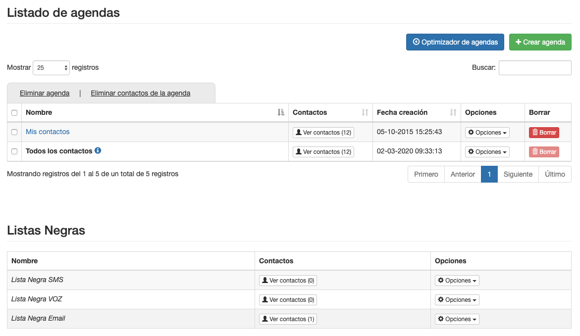 Puedes consultar que contactos están en cada una de las Listas Negras desde el Listado de Agendas de tu cuenta.